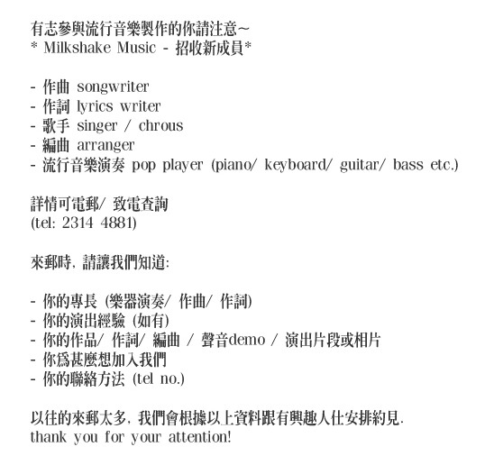 歡迎連同個人簡介及聯絡方法電郵給我們: milkshakemusic@gmail.com
