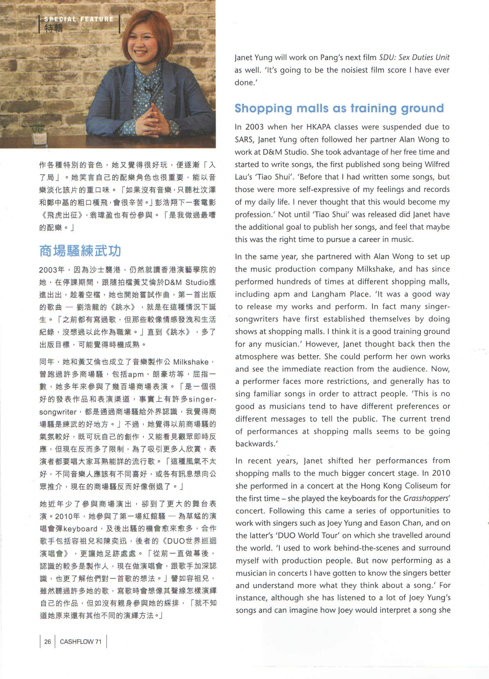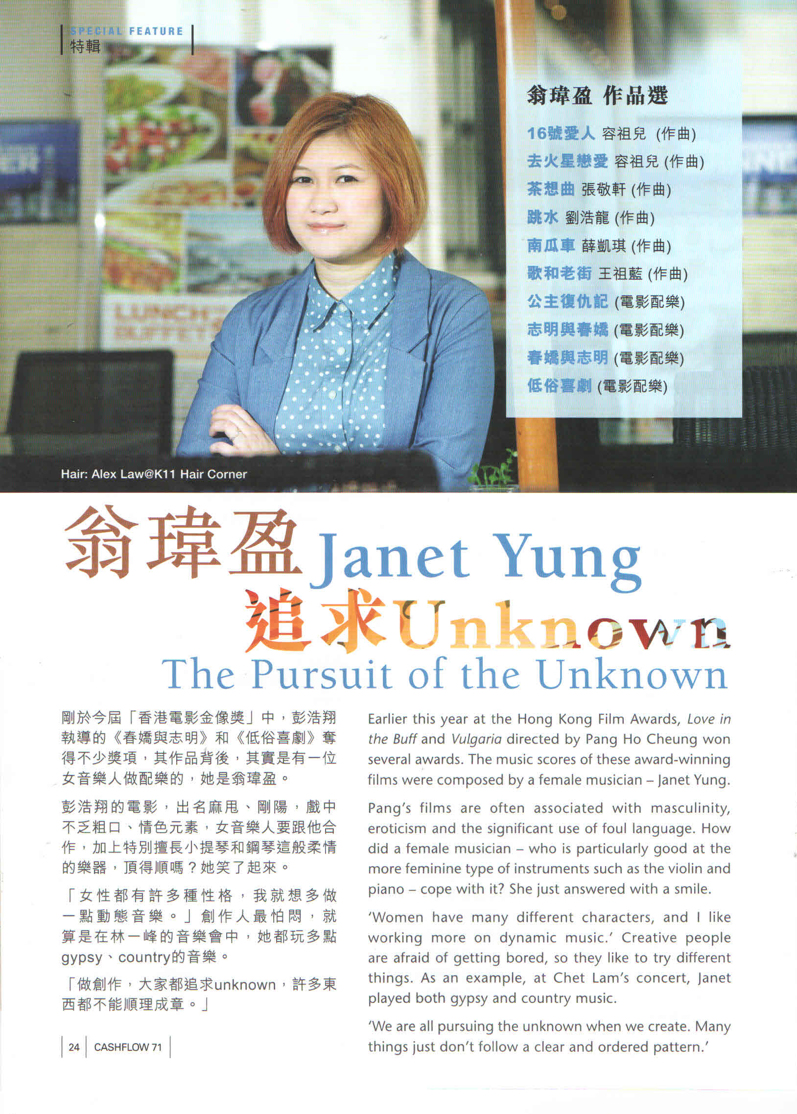 Janet 早前接受了 CASH 官方雜誌以女作曲或作詞家為題的專訪, 刊登於 2013 年 5 月出版的第 71 期的 “CASH FLOW" (CASH 官方雜誌)